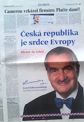 V denících Lidové noviny a Blesk se objevují také inzeráty Karla Schwarzenberga se známými motivy jeho kampaně.