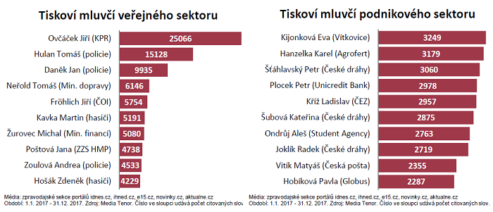 Mluvčí prezidenta ČR Jiří Ovčáček se počtvrté v řadě stal nejcitovanějším mluvčím na českých zpravodajských serverech. Zatímco mluvčí prezidenta dosáhl přibližně stejného počtu odcitovaných slov jako v roce 2016, policejní mluvčí Tomáš Hulan svoji citovanost zvýšil meziročně o dvě třetiny. Společně s policejním kolegou Janem Daňkem (třetí nejcitovanější mluvčí) tak přispěli k částečné meziroční vizuální proměně žebříčku. Výsledky pramení z analýzy Media Tenor, která sledovala příspěvky serverů idnes.cz, ihned.cz, e15.cz, novinky.cz a aktuálně.cz.