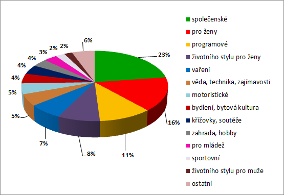 Největší čtenosti dosahují společenské magazíny, následované tituly pro ženy a programovými časopisy. Tituly zmíněné trojice segmentů představují 50 % čtenosti všech sledovaných časopisů. Právě programové tituly jako celek udržují i přes rostoucí konkurenci svoji čtenost, dokonce ji mírně zvyšují. To se v prvním pololetí dařilo i ekonomickým titulům. Naopak mezi viditelněji klesající segmenty patří časopisy pro mládež, sportovní tituly, tituly o hobby a zahradě či magazíny životního stylu pro muže.