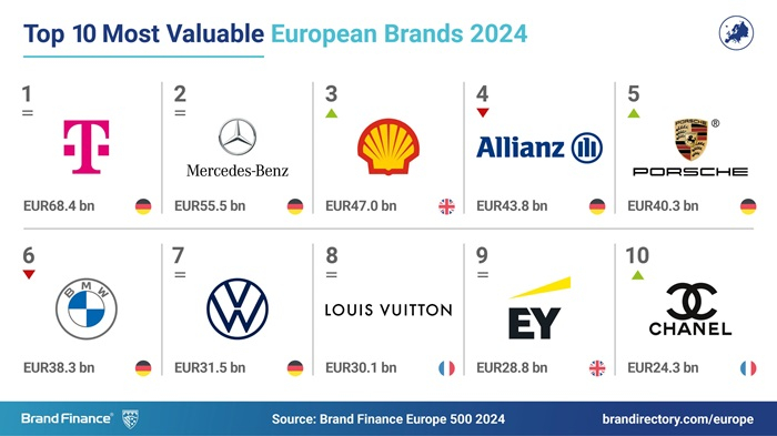 Deutsche Telekom (T-Mobile) udržela druhý rok po sobě prvenství v žebříčku TOP 500 nejhodnotnějších evropských značek, který sestavuje Brand Finance. Hodnota její značky vzrostla meziročně o 13 % na 68,4 mld. euro. V těsném závěsu se na druhé pozici drží německá značka Mercedes-Benz (hodnota značky 55,5 mld. euro). Třetí nejhodnotnější je Shell, následují Allianz a Porsche.