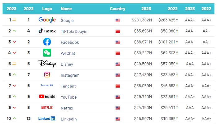 Google zůstává nejhodnotnější světovou mediální značkou třetí rok v řadě. Její hodnota je čtyřnásobně vyšší než u druhého TikToku a podle nového žebříčku Brand Finance meziročně vzrostla o 7 % na 281,4 miliardy USD. Rostl také druhý v pořadí TikTok, který si meziročně polepšil o dvě místa a svoji hodnotu navýšil o 11 % na 65,7 mld. USD. Trojici nejsilnějších uzavírá Facebook s hodnotou 59 mld. USD.
