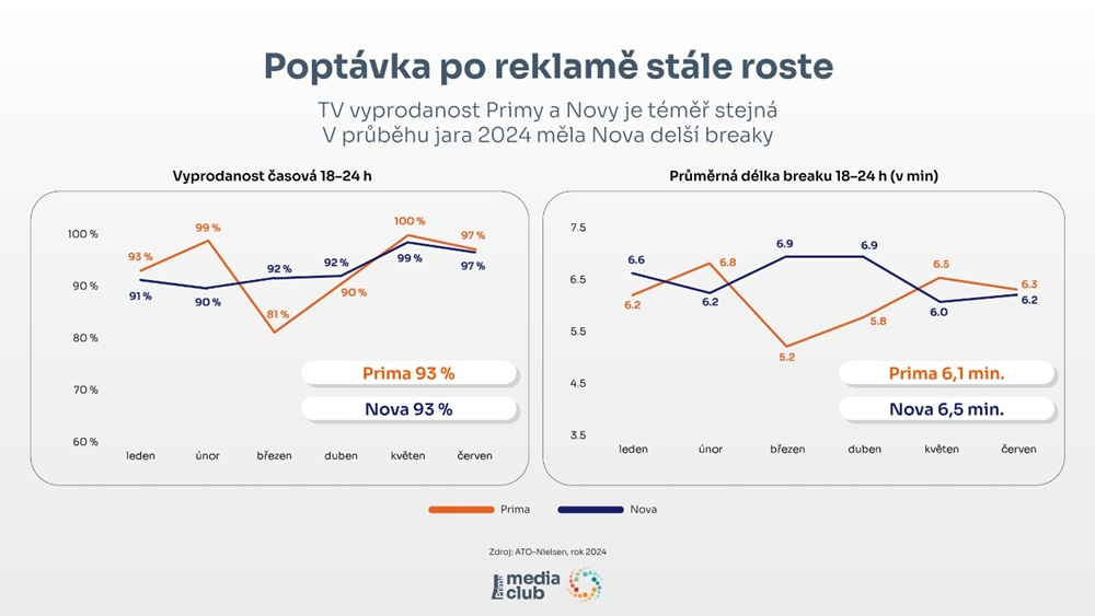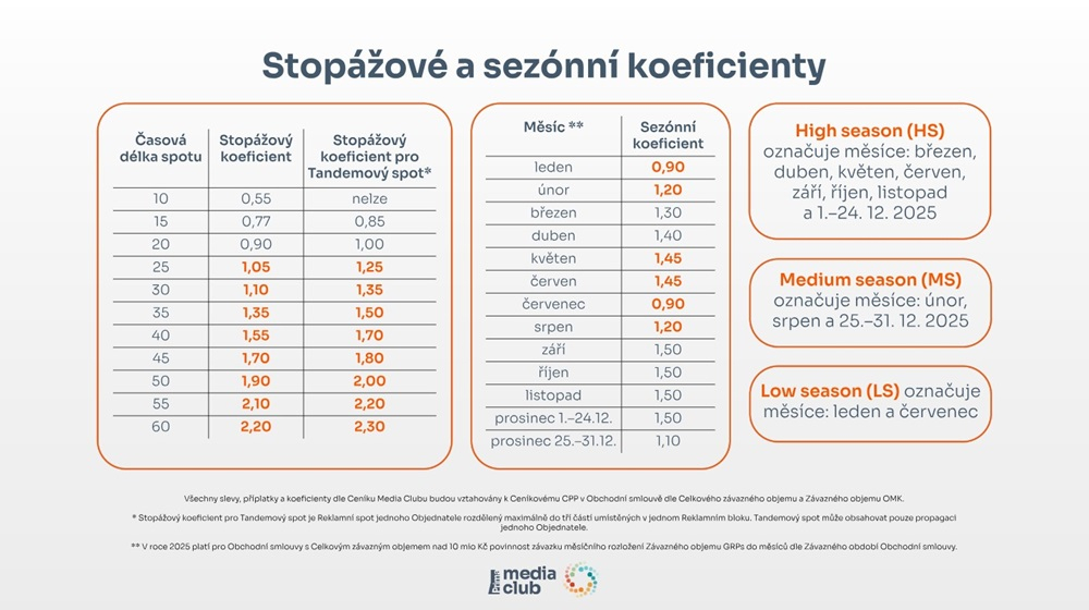 Obchodní zastupitelství Media Club zvýší pro rok 2025 ceny televizní reklamy v průměru o 18 až 22 %. Navýšení zohledňuje jak růst základní ceny CPP, tak také růst některých sezónních i stopážových koeficientů. Portfolio zastupovaných stanic Media Clubu se ale pro příští rok nemění: vedle stanic skupiny Prima, které se rozšíří o dva nové kanály, má nadále prodávat reklamu i pro skupiny TV Óčko, TV Barrandov, Atmedia i Paramount Network. Stejná zůstává také primární nákupní cílová skupina 18–69 let. Sekundárně pak mohou klienti využívat také 24 definovaných cílových skupin.
