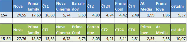 Ve skupině diváků starších 15 let byl minulý týden nejpříznivější pro stanice Prima. Vedle Prima Cool se dařilo i Prima family, jejíž podíl se oproti předcházejícímu týdnu zvýšil na 17,69 %. Oba hlavní kanály konkurenčních TV poklesly – ČT1 pod 17 % a TV Nova pod 25 %.