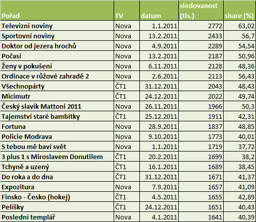 Pohled na nejsledovanější televizní pořady v roce 2011 potvrzuje, že loňský rok byl ve znamení především českých filmů a původních seriálů. Mezi nejsledovanější pořady se také zařadily některé zábavní show, v případě hokejového mistrovství pak hokejové přenosy.