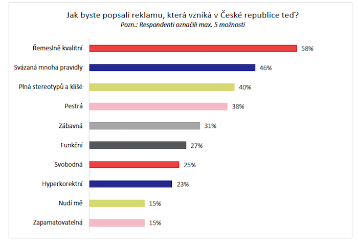 Třetina dotázaných si myslí, že pravidel a omezení je v reklamním průmyslu příliš a každé nové pravidlo je hřebíčkem do pomyslné rakve kreativity. Nicméně o něco málo silnější je názor, že současné regulativy stále ještě umožňují udělat atraktivní a efektivní reklamu – to si myslí 38 % respondentů. Čtvrtina dotázaných považuje tyto restrikce za nezbytnost v rámci kultivace reklamního prostředí. Pouze 4 % dotázaných by regulaci reklamy ještě více zpřísnila. Pokud by měli marketéři možnost uvolnit si ruce pro kreativní rozlet, zrušili by především hyperkorektnost. Více než polovina z nich by změnila také nastavení interních postupů v rámci firmy a omezila příliš demokratický rozhodovací proces.