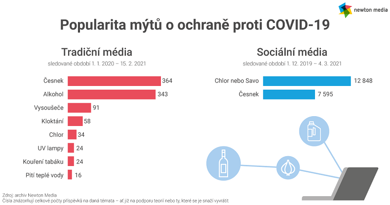 Za původem koronaviru stojí Bill Gates a šíří ho pomocí 5G sítí a před pandemií nás ochrání česnek či dokonce dezinfekce vpravená do žíly. I tak by se daly shrnout nejpopulárnější teorie o vzniku a šíření nemoci covid-19 a o možných způsobech, jak onemocnění čelit, které se objevují v českých médiích. Tyto teorie spojuje přesvědčení, že koronavirus byl uměle vytvořený nebo aspoň uměle rozšířený, aby určitým elitám umožnil ovládnout svět. Příspěvky, které se snaží konspirační lži a polopravdy veřejnosti odhalovat, však v médiích převažují nad těmi, které je šíří. Vyplývá to z analýzy společnosti Newton Media, která zmapovala nejčastější mýty týkající se covid-19.