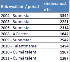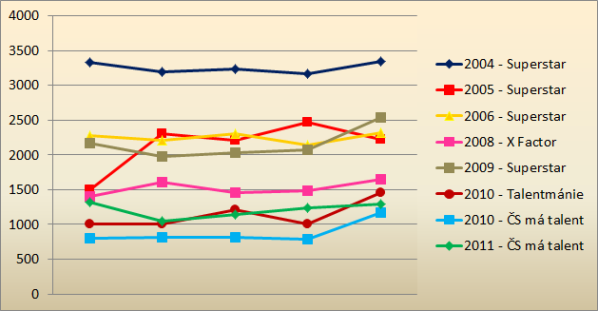 Jak je patrné z níže uvedeného grafu, každé další vysílání nové řady nebo nového typu dovednostní reality show v zásadě znamenalo nižší sledovanost. Určitou výjimku představují roky 2008 a 2009, kdy se ukázalo, že Superstar dokázala přilákat více diváků než X Factor, vysílaný o rok dříve. A jak už bylo zmíněno, na výsledku loňských pořadů (ČS má talent vs. Talentmánie) se odrazilo jejich nasazení proti sobě.