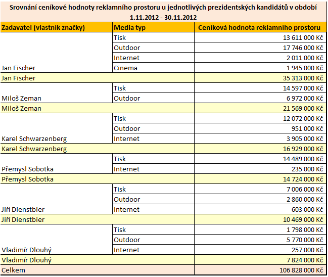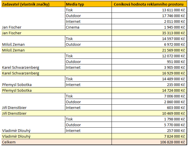Hrubé monitorované investice za období letošního roku (1.1.-30.11. 2012) prezidentských kandidátů přesáhly podle společnosti Admosphere více než 106 mil. Kč. Nejvyšší částku přisuzuje monitoring Janu Fischerovi, a to ve výši 35 mil. Kč s tím, že necelých 18 mil. Kč bylo vynaloženo na venkovní reklamu.