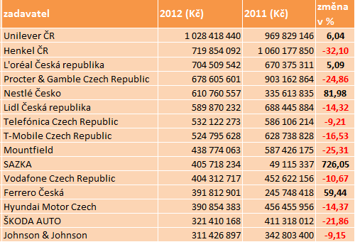 V první patnáctce největších zadavatelů je ale pouze několik výrobců, kteří své investice oproti stejnému období vloni nesnížili. Týká se to především Sazky, která znovu letos nastartovala svoji reklamní komunikaci, monitoring také přisuzuje vyšší nárůst firmám Nestlé Česko a Ferrero.