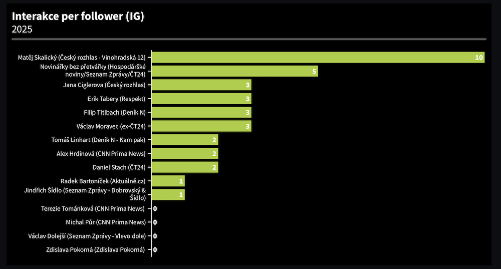 Z pohledu počtu interakcí v přepočtu na jednoho sledujícího se jako první umístil Matěj Skalický, který od jednoho sledujícího získal 10 interakcí. Velmi dobře svému publiku rozumějí také Novinářky bez přetvářky, které od jednoho sledujícího získaly 5 interakcí.