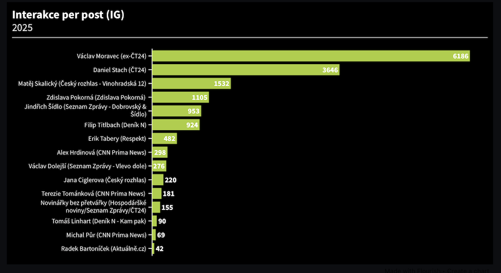 Při porovnání průměrných interakcí na jeden příspěvek žebříčku opět dominuje Václav Moravec s téměř 6200 interakcemi. Díky tomuto zisku má Václav Moravec velký náskok před druhým Danielem Stachem, jehož příspěvky průměrně získaly přes 3600 interakcí. Na třetím místě se umístil Matěj Skalický s více než 1 500 interakcemi. Čtyřciferný výsledek získala také Zdislava Pokorná z Deníku N, která průměrně sbírá přes 1 100 interakcí.