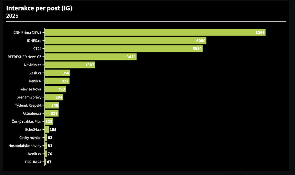 Průměrných interakcí na jeden příspěvek dosahuje nejvíce CNN Prima News s téměř 8300 interakcí, což jí dává nezanedbatelný náskok před iDnes.cz na druhém místě s více než 6 tisíci interakcemi na jeden post a před ČT24 s necelými 6 tisíci. Vysoko se v žebříčku znovu umisťuje opět Refresher News CZ, který i tentokrát předstihl mnohé zavedené značky.