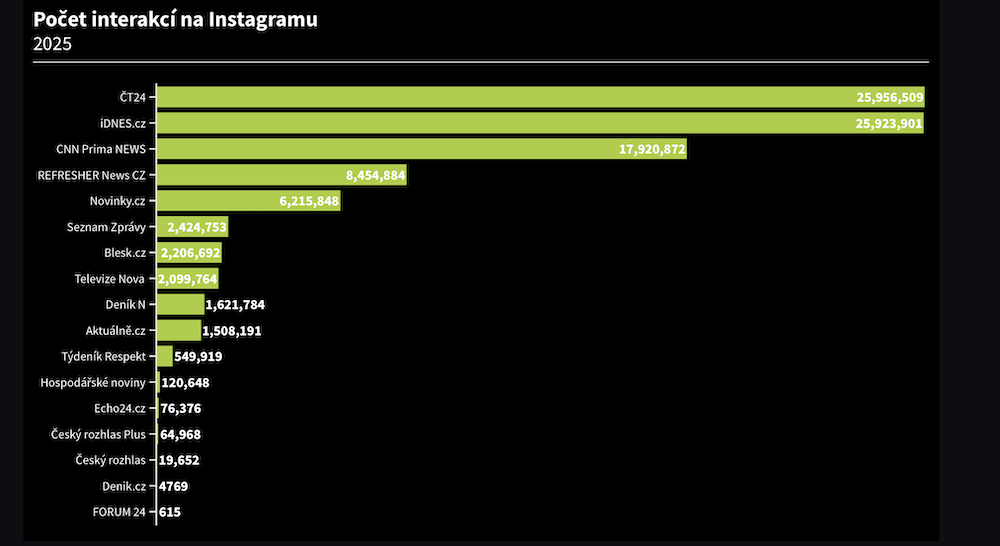 Mezi médii dominují tradiční značky, ČT24 a iDnes.cz, s téměř 26 miliony interakcí. O vítězství ČT24 rozhodlo 32608 interakcí, což je v poměru k celkovému zisku skutečně těsný rozdíl. S odstupem první trojici uzavírá CNN Prima News s téměř 18 miliony interakcí. Zajímavé je, že po třech tradičních značkách se vysoko umístilo i relativně nové médium, a to Refresher News CZ. Refresher se profiluje jako médium pro mladší publikum a jeho novinářská větev na Instagramu nasbírala téměř 8 a půl milionu interakcí. Refresher News CZ tak přeskočil zažité české zpravodajské portály jako Seznam Zprávy, Aktuálně.cz nebo Hospodářské noviny.