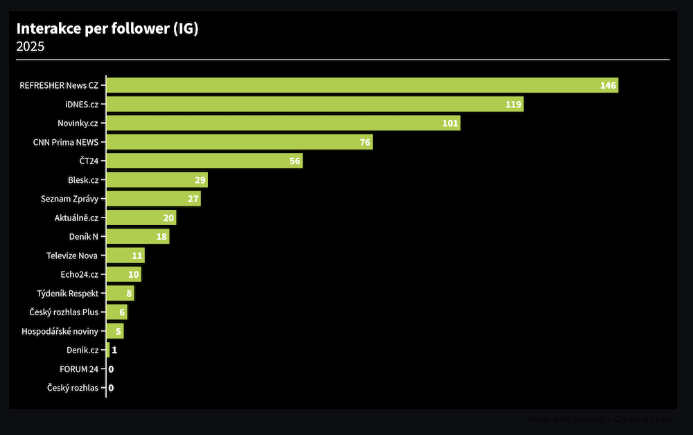 Nejvíce interakcí na počet sledujících získává Refresher News CZ, kde jeden sledující zanechal téměř 150 interakcí. Hranici sta interakcí na jednoho sledujícího překonal také iDnes.cz s průměrem téměř 120 interakcí a těsně i Novinky.cz. Do první trojice se naopak nedostala CNN Prima News, u níž jeden sledující zanechal necelých 80 interakcí, ani absolutní vítěz ČT24, kde běžný sledující s příspěvky interagoval téměř 60krát. Na sdíleném posledním místě jsou dva profily – Forum 24 a Český rozhlas, u nichž jsou průměrné interakce na sledujícího nižší než 0,5.