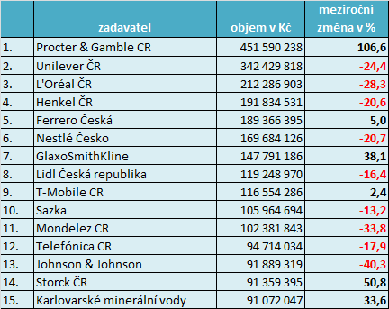 Na pozici největšího televizního zadavatele se v prvních čtyřech letošních měsících propracoval Procter & Gamble, který oproti loňskému období ledna-dubna své investice v letošním roce zdvojnásobil. Většina velkých televizních zadavatelů ale letos investuje méně než loni (např. Henkel ČR, Unilever, L′Oreál, Nestlé, Mondelez či Johnson & Johnson).