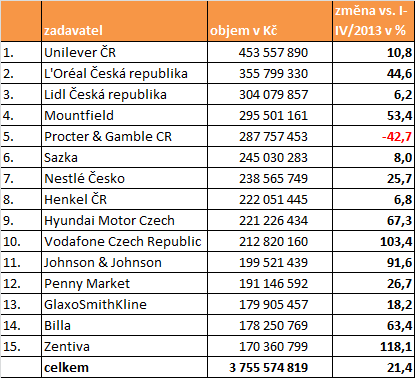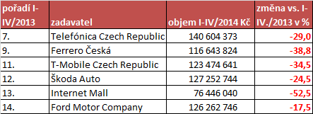 Ve srovnání s přehledem nejsilnějších zadavatelů za loňské stejné období je patrné, že první pětice zadavatelů se příliš nezměnila. Za pozornost stojí meziroční snížení výdajů společnosti Procter & Gamble. Z druhé poloviny zadavatelů z loňského období prvních čtyř měsíců oproti loňsku vypadli mj. mobilní operátoři Telefónica a T-Mobile.