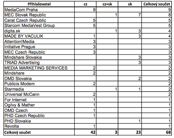 Nejvíce přihlášek poslaly do soutěže agentury MediaCom Praha (9) a slovenská Mediaedge:cia (8).