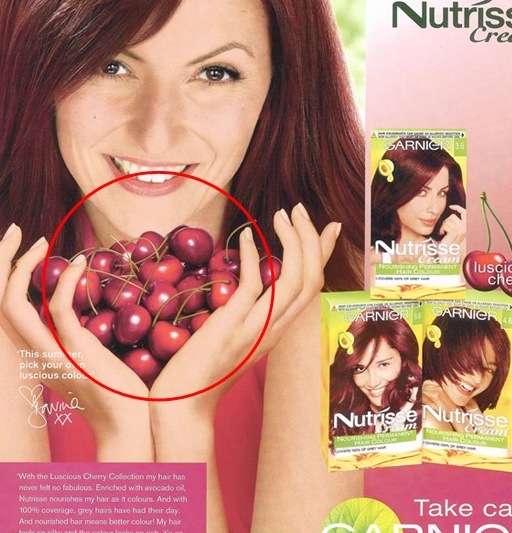 Úpravy ve Photoshopu poněkud přehnala i značka kosmetiky Garnier. Její britská reklama tak spíše než barvu na vlasy propaguje speciální odrůdu gigantických třešní.