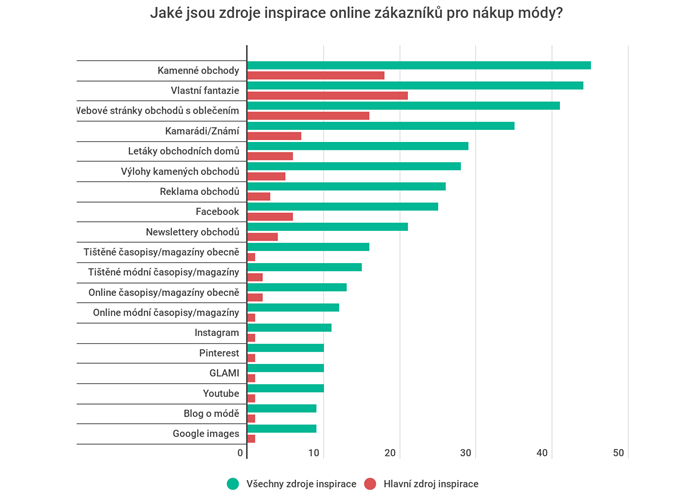 Inspiraci k nákupu módy hledají Češi kromě své vlastní fantazie zejména v kamenných obchodech a na webových stránkách. Naopak tištěné i online módní magazíny či sociální sítě hrají v inspiraci menší roli.