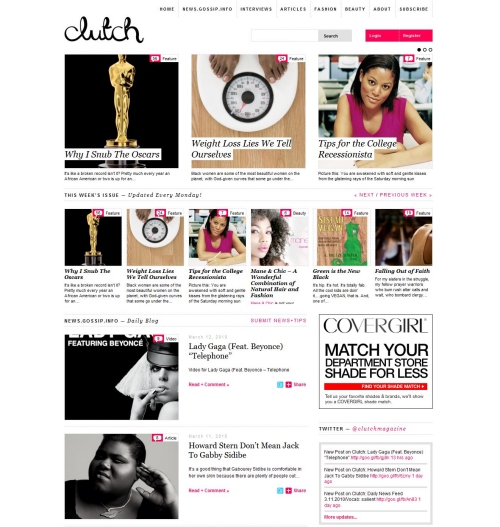 Za pozornost však stojí i specializované weby. Kupříkladu lifestylový magazín Clutch, který se orientuje na černošskou populaci žen v USA, využívá v současnosti moderní kombinace černé a bílé se stejně populárním mřížkovým uspořádáním.