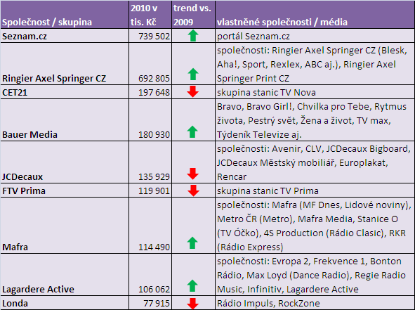 Provozovatelé komerčních televizních stanic, CET 21 (skupina Nova) a FTV Prima (skupina Prima) své zisky v roce 2010 snížily (zejména CET 21, která tím v roce 2010 přišla o pozici mediální firmy s nejvyšším ziskem v Česku).