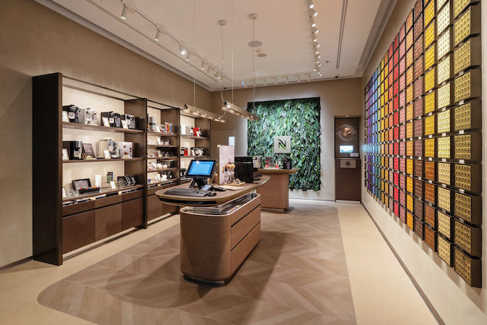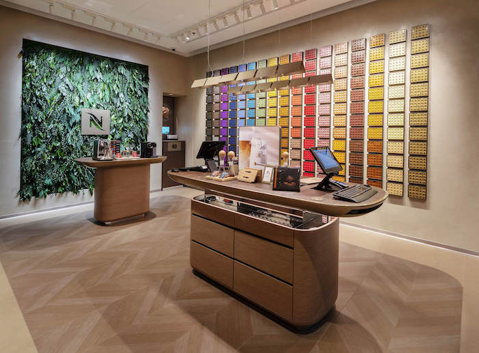 Dominantu interiéru tvoří vertikální živá zahrada o výšce přes 2,5 metru. Zahrada je tvořena tzv. stabilizovanými rostlinami, které jsou zcela přírodní a ekologické. Nechybí ani Nespresso stěna tvořena kávami po celé délce butiku. Kromě kávy a kávových balíčků si mohou zákazníci vybrat i mezi kávovary a doplňky, včetně sortimentu k servírování.