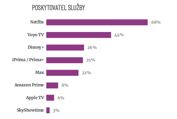 Nejsilnější VOD službou na českém trhu zůstává Netflix. Má k němu přístup 68 % domácností, které využívají streamovací službu. Vyplývá to z nově zveřejněného výzkumu NMS Market Research, jehož závěry zveřejnila společně s Asociací provozovatelů mobilních sítí. Podle výzkumu druhé Voyo je přítomné v 44 % domácnostech. Třetí je Disney+ (26 %), jehož podíl je ale téměř stejný jako v případě Prima+ (25 %). Pokud by se dosah vedoucího Netflixu přepočítal na celý dotazovaný vzorek, tedy včetně těch, kteří žádnou streamovací službu nemají, představoval by jeho dosah 38 % celkové populace 15-79 let.