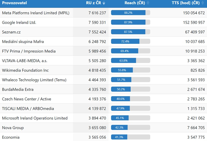 Z prvních publikovaných dat vyplývá, že nejvyšší zásah na českém internetu má Meta (Facebook, Instagram aj.), Google a třetí je Seznam. Data se vztahují k návštěvnosti jen v Česku, nikoli ze zahraničí. Počet reálných uživatelů je u uvedené trojice vyrovnaný, počet strávených hodin je ale u obou nadnárodních platforem výrazně vyšší.