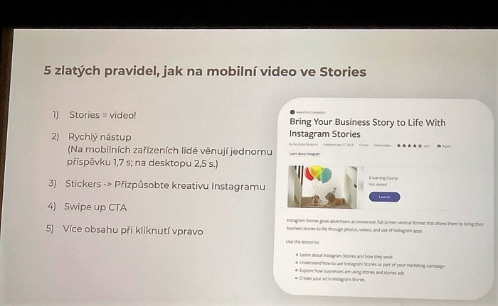 Protože firma Business Factory se stala i kreativním partnerem Facebooku, doporučil posluchačům, jak ideálně připravit reklamu pro mobilní Stories. Zásadou přitom je, že by měla vždy obsahovat video, které by mělo být dynamické a hned od začátku prezentovat produkty nebo služby. Na zaujetí mají zadavatelé necelé dvě vteřiny.