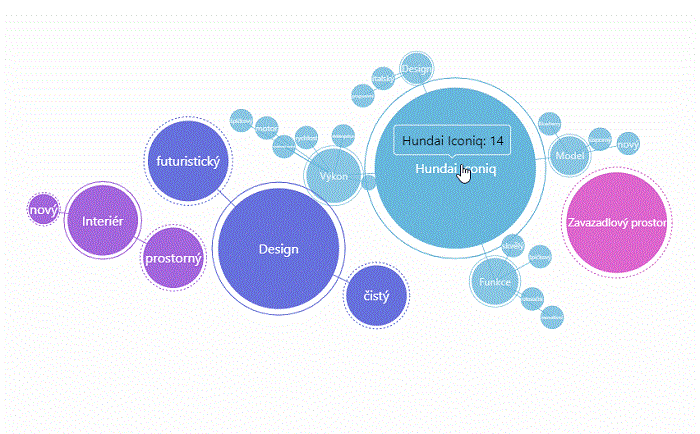 „Stačí kliknout na kategorii automobilový průmysl a hned zjistíte, jak silná je jeho medializace, jak si vedou jednotlivé modely aut anebo které vozy podle médií představují pro Hyundai konkurenci. Můžete se dozvědět, kteří autoři píšou o značce nejvíce, a které modely mají nejraději. Dokážeme také analyzovat větné členy a zobrazit vztahy mezi klíčovými slovy. Díky tomu uživatel zjistí, jaké vlastnosti jsou spojované s danou značkou v médiích,“ pokračuje Lhotská.