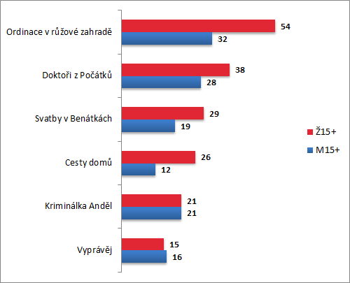 Pondělní a středeční seriály – Cesty domů a Doktoři z Počátků – míří také především na ženské publikum. Přestože Doktoři z Počátků dosahovali v prvním pololetí u ženského publika celkově vyššího podílu než Cesty domů, rozdíl mezi ženským a mužským publikem je výraznější u Cest domů, kde jsou ženy s větší převahou hlavními diváky seriálu.