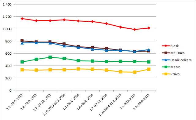 | celostátní deníky | 2+3Q/2015 | 1+2Q/2015 | kvartální změna v % | 2+3Q/2014 | meziroční změna v % |