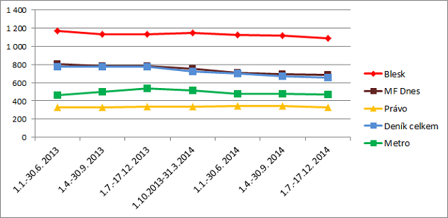 Vývoj čtenosti mezi celostátními deníky se příliš nemění. Nejčtenější zůstává Blesk s vyšší čteností než milion čtenářů na vydání. Následují MF Dnes a Právo. Jediným deníkem, který si ve srovnání s daty za poslední měřené období 2.a 3. čtvrtletí 2014 polepšil, byl deník Lidové noviny. Ostatní deníky v mezikvartálním srovnání mírně klesaly. Poklesy ale nejsou statisticky významné. Platí to i pro regionální deníky, kde je jedničkou Deník s průměrnou čteností na vydání 655 tisíc čtenářů, a pro bezplatné deníky.