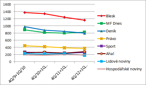Nejčtenějším deníkem zůstává Blesk, v mezikvartálním srovnání si většina deníků udržela výsledky z loňského druhého pololetí. V meziročním srovnání je překvapivý vyšší pokles čtenosti Lidových novin, přestože prodaný náklad deníku klesá v meziročním srovnání nejméně ze všech deníků. S výsledky prodaného nákladu také nekoreluje nárůst čtenosti deníku Aha!, jehož prodaný náklad naopak meziročně klesá více.
