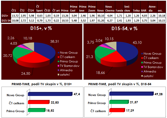 Nejsledovanějším úterním večerním pořadem je s náskokem seriál Ordinace v růžové zahradě (TV Nova), jehož další díl zhlédlo v průměru necelých 1,8 mil. diváků starších 15 let. Díky tomu Nova Group ovládla prime-time. Ve své hlavní cílové skupině 15-54 zaznamenala v hlavním vysílacím čase více než 49% podíl.