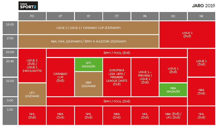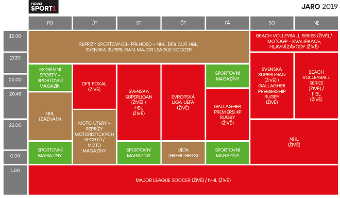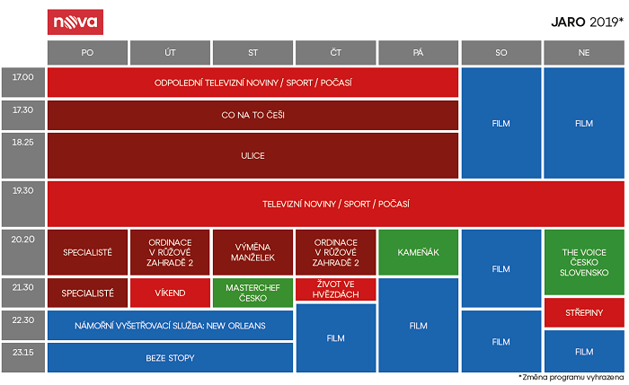 Nova v jarním schématu pokračuje se svými vlajkovým pořady, které už uvedla od začátku roku – seriály Ulice (po-pá), Ordinace v růžové zahradě (út, čt) a Specialisté (po), dále reality show Výměna manželek (st) a kuchařská show MasterChef Česko (st).