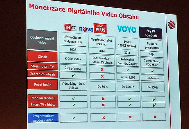 Konkurenční skupina Prima zase začne testovat aukční prodej online reklamy (vedle programatiku), řekl na konferenci Petr Hatlapatka z FTV Prima. "Otestujeme prodej určitých formátů a poté uvidíme, jak to bude fungovat," sdělil. Vedle toho Prima už přemýšlí o HbbTV 2.0 – tedy o "přepsání" spotu spotem jiným, který je určen jinému publiku. To je ale podle Petra Hatlapatky dlouhodobější záležitost, která souvisí s obměnou televizních přístrojů a může trvat i několik let.