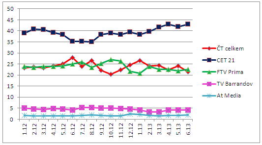 Česká televize si sice v hlavním vysílacím čase (15+) a v mladší skupině 15-54 meziročně pohoršila více než Prima Group, toto snížení ale souvisí se sportovním kanálem ČT Sport, který loni téměř celý červen vysílal přenosy z fotbalového mistrovství v Polsku a na Ukrajině. Proto je snížení patrné především v prime-time. Ostatní kanály ČT dosáhly v celodenním vysílání (15+) srovnatelného (ČT2), nebo mírně lepšího výsledku (ČT1). Meziročně v červnu vyrostl zejména zpravodajský kanál ČT24.