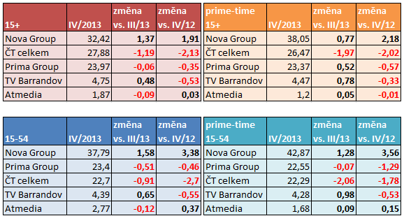 Svůj loňský dubnový výsledek nepřekonala ani Česká televize. Její souhrnný podíl byl zejména kvůli ČT Sport v letošním dubnu nižší o cca 2 procentní body ve srovnání s dubnem 2012 a o více než 1 procentní bod ve srovnání s březnem 2013 (D15+, celý den).