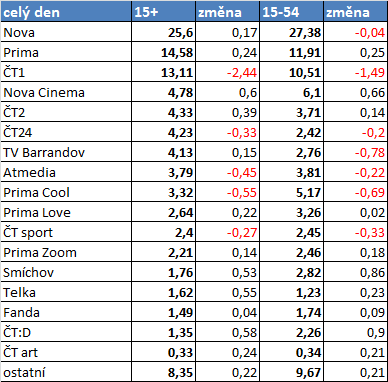 Meziročně posílil i druhý kanál ČT, jakož i nové kanály ČT:D a ČT art. Lépe než v loňském září si vedla také TV Barrandov (platí pro celodenní vysílání 15+).