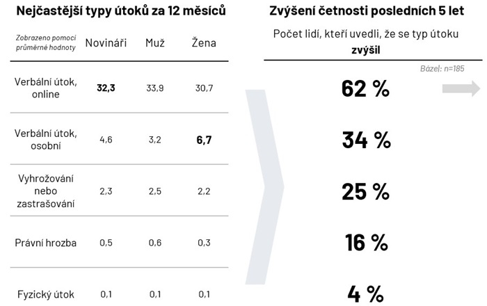 Útoky na novináře pokládají za skutečnou hrozbu pro svobodu tisku téměř čtyři pětiny těch, kteří dotazník vyplnili, a 14 % dokonce zvažovalo, že kvůli agresi ukončí kariéru. Většina novinářů (60 %) ale zároveň uvedla, že poslední útok, se kterým se setkali, nikomu nehlásili. Jedná se především o slovní útoky v online prostoru, ale také o verbální osobní agresi nebo zastrašování.