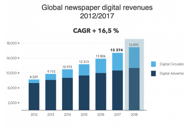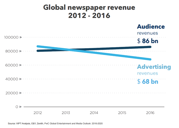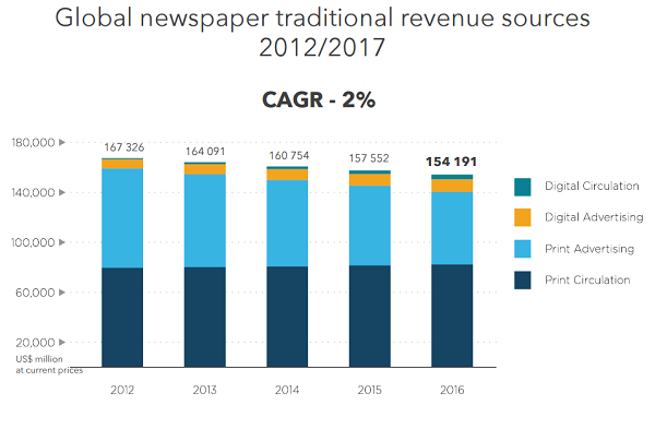 Celkové výnosy od čtenářů novin se loni meziročně zvýšily o 2 %, za poslední čtyři roky vzrostly dokonce o 7 %. Na druhou stranu klesají výnosy z inzerce. V loňském roce se meziročně snížily o 7 % a od roku 2012 dokonce o pětinu (-21 %). Výjimku v poklesu inzertních výnosů představují regiony Asie, Afriky a Latinské Ameriky. Novinové odvětví v loňském roce celkově inkasovalo 154 mld. USD, což bylo o 2 % méně než v roce 2015. Klesající příjmy z prodeje tištěné reklamy tak nejsou zcela kompenzovány nárůsty výnosů z digitálního prodeje obsahu a inzerce (meziročně +17 %).