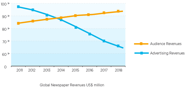 Výnosy světových novin dosáhly v loňském roce celkové částky 168 mld. USD, což bylo meziročně o 1,2 % méně. Za období posledních pěti let se souhrnné výnosy světových novin snížily o 4,3 %. Vyplývá to z letošní zprávy World Press Trends, kterou pravidelně sestavuje asociace WAN-IFRA. Podle zprávy nadále pokračuje trend růstu podílu výnosů z distribuce (tištěné a digitální) a naopak pokles podílu výnosů z inzerce. Podíl výnosů z distribuce (prodaný náklad tištěných verzí, prodej online obsahu) už má představovat 58 % na celkových novinových výnosech. Prognóza do roku 2018 je přitom taková, že se nadále očekává pokles podílu výnosů z reklamy a mírně stoupající trend podílu výnosů z prodeje obsahu (distribuce).