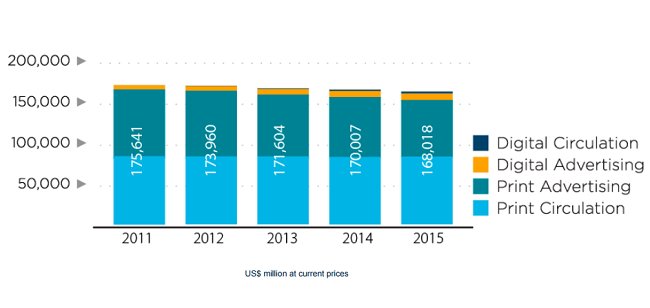Základem financování novin zůstávají i přes rozmach digitálních médií především výnosy z tištěného obsahu a z tištěné inzerce. Celkový objem digitální reklamy a digitálního obsahu je zatím výrazně menšinový. Výnosy z digitální inzerce online verzí světových novin měly loni růst jen o 7,3 % na celkových 9,3 mld. USD. Výnosy z digitálního obsahu se loni meziročně zvýšily o 31 % na celkových 3 mld. USD.