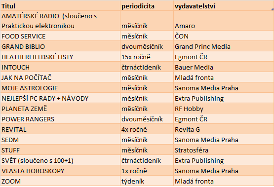 Mezi ukončenými tituly loňského roku jsou některé licenční časopisy (InTouch, Stuff), počítačový Jak na počítač (Mladá fronta), nebo Food Service vydavatelství ČON, které bylo vloni prodáno.