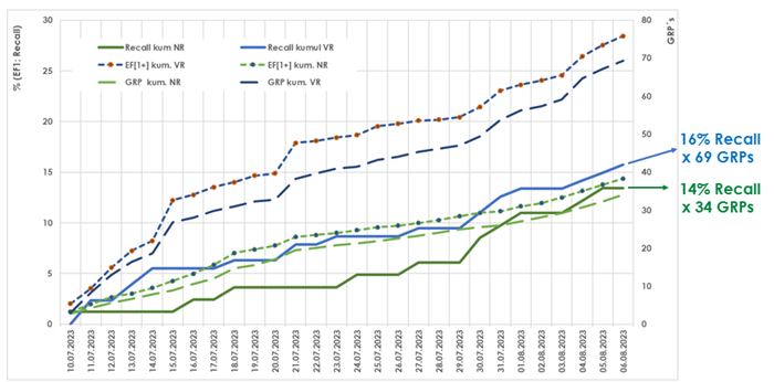 Výsledky ukázaly, že NR spoty bylo zasaženo 213 respondentů a VR spoty 258 respondentů. Na vybavení spotu (recall) měly přitom NR a VR spoty srovnatelný vliv. Celková hodnota recallu kampaně dosáhla 16 %, z čehož recall u respondentů zasažených jen NR spoty byl 14 % a u respondentů zasažených pouze VR spoty byl 16 %. VR spoty vygenerovaly v kampani dvojnásobně vyšší počet GRP (69 GRP vs. 34 GRP u spotů s nízkým ratingem). I přes vyšší počet GRPs (reache) u VR spotů představoval recall srovnatelnou úroveň s NR spoty. Při srovnatelném počtu GRP u obou typů spotů je navíc příspěvek u NR spotů nepoměrně větší – konkrétně dvojnásobně.