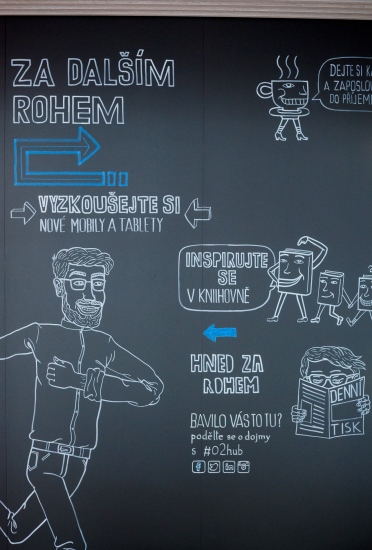 Kromě co-workingových stolů, oddělených prostor a kavárny je součástí O2 Hubu i knihovna nebo technologický showroom s nejnovějšími produkty z nabídky.