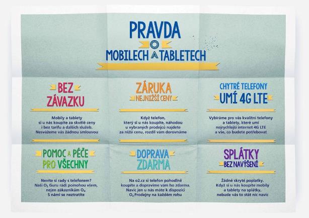 Společnost O2 přichází s tzv. deklarací „Pravda o mobilech a tabletech“, kterou má údajně pomoci zákazníkům při nákupu telefonu. Deklaraci, kterou se O2 zavazuje například k záruce nejnižší ceny, dopravě zdarma či pomoci a péči pro všechny, podpoří dlouhodobou nadlinkovou kampaní.