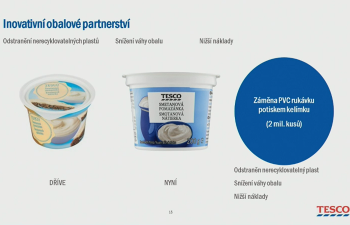 Jaroslav Vodáček, CE Lead Packaging Manager Tesco, vede tým, který má primárně na starosti obaly vlastních značek. Řetězec se podle jeho slov snaží postupně měnit obaly vlastních značek a klade důraz na udržitelnost a recyklovatelnost. Obaly má rozdělené barevně na červené, žluté a zelené, podle toho, jak lze recyklovat. Seznam je volně dostupný na webových stránkách.