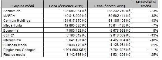 Tabulka uvádí TOP 10 skupin médií, u kterých zadavatelé reklamu nakupovali. V rámci této skupiny se proinvestovalo téměř 223 mil. Kč v ceníkových cenách. Nárůst zaznamenala pouze skupina Business Media, v rámci které se prodalo o 81 % reklamího prostoru více než předchozí měsíc. Ostatní média zaznamenala pokles.